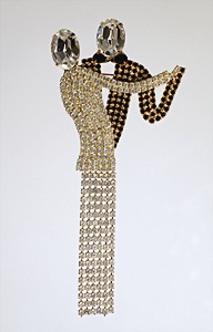 Große Brosche in Form eines tanzenden Paares, goldfarben, unsigniert, die Köpfe bilden zwei ovale Strasssteine, Körper aus klarem und schwarzen Pavé-Strass, Rock der Dame als strassbesetzte Abhängung (8 Stränge), H = ca. 13,5 cm