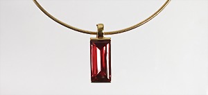 Reif mit Anhänger: großer Anhänger, goldfarbenen (unsigniert), geschliffenen Glasstein im leuchtendem Rot, H = ca. 46,0 mm (Schlaufe zum Öffnen; Omega-Halsreif; signiert auf einem kleinen Anhänger mit Krone und "London", L = 42,5 cm