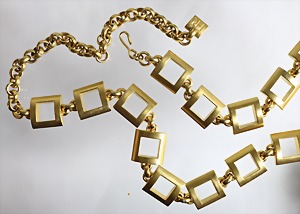 graphischer Kettengürtel von HELENA RUBINSTEIN Paris, goldfarben, signiert: HR. matte Oberfläche, quadratische Kettenelemente, massive Ausführung. B = 24,8 mm, L = 83,0 - 107,5 cm (Verlängerungskette), schöner Klassiker !