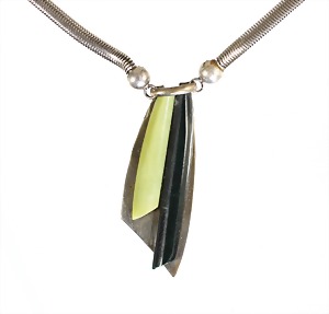 Collier, "ART-DECO" der 1920/30er Jahre, "BENGEL" Idar-Oberstein, Metall, schwarz u. grünes Galalit, vorne H = 50,5 mm, flache Schlangenkette, L = ca. 52,0 cm