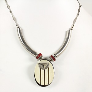 Collier, "ART-DECO" der 1920/30er Jahre, "BENGEL" Idar-Oberstein, Metall, weißes u. braunrotes Galalit, vorne H = 38,1 mm, gestaltete Kette, L = ca. 41,8 cm