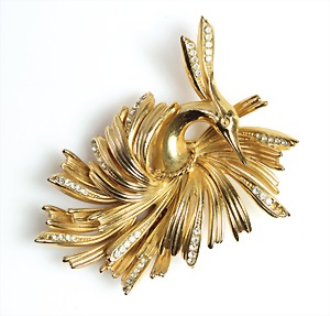 Brosche "PARADISVOGEL" von "DIOR", Metall, goldfarben, sig: Chr. Dior, weißer Steinbesatz, ca. 45 x 61 mm