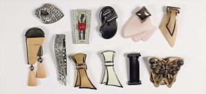 Kleiderclips (11 Stck.), 1.Hälfte 20.Jhd, Metall, verschiedenfarbiger Kunststoff, teilweise mit Strass besetzt