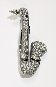 Brosche "SAXOPHON", Silber, sig.: MADE IN ZECH SLOWAK, schwarzer Emaillelack, weißer Strassbesatz, H = 48,0 mm