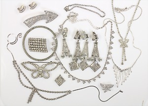 Lot: Modeschmuck, weißes Metall, weißer Strass, diverse Ohrhänger, Broschen, Armreif…..!