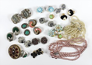 Lot Modeschmuck: 13 Paar Ohrclips (besetzt mit Glas, Strass oder Emaillelack); 1 kl. Blüten-Brosche; 1 gr. ovale Brosche mit rotem Steinbesatz ca. 50,5 x 45,5 mm; 2 - u. 4 - reihige Perlenkette; 1 Ring mit grünem Stein, RW ca. 56