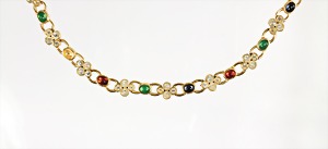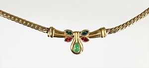 Collier von "CARVEN" Paris, signiert: carven, besetzt mit roten u. grünen Strasssteine, L = 42,5 u. 46,5 cm (Verlängerung zum herausnehmen !)