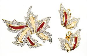 Lot: Brosche u Ohrclips, sig.: D`ORLAN 7019, weißer Strassbesatz, beige -u. rotbrauner Emaillelack, Brosche ca. 60 x 48 mm; Clips ca. 29 x 29 mm