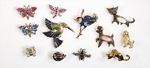 Lot: 12 Teile Modeschmuck, gelbes/weißes Metall, farbiger Strass, Vögel, Schmetterlinge, Katze, Hunde und mehr !