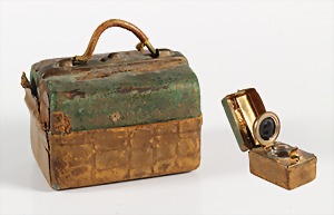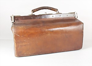 Ärztekoffer 1940/50er Jahre, Leder, innen mit Stoff ausgeschlagen. An den Enden der Metallleiste mit Klappbügeln zu sichern, ca. 41 x 25 x 21 cm, schöne Pattina !