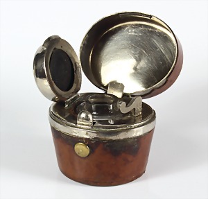 Reisetintenfass um1830, in Form einer "HUTSCHACHTEL", weißes Metall, sig.: K.K.PR… mitDoppelkopfadler (Marke), Gehäuse lederbezogen, mundgeblasenes Glas, Fass-Deckel mit Verschlussmechanik, H = ca. 45,0 mm, Leder berieben !