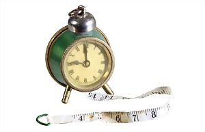 "MAßBAND", kleiner Tischwecker um 1900, in das Gehäuse ist ein Maßband eingearbeitet, grünes Zelluloid, H = ca. 54,5 mm,