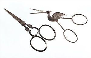 2 Scheren, Solingen um 1900, Eisen, 1 Schere als "STORCH" ausgearbeitet, fein strukturierte Oberfläche, L = 83,0 mm; 1 Schere mit zartem Federmuster verziert, L = 85,6 mm
