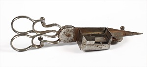Dochtschere um 1800, Stahl, Auffangbehälter für Docht und Wachs mit separatem Schließmechanismus ! 3 Kugelfüße, L = 17,5 cm,