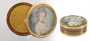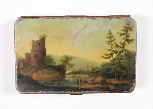 Eisendose um 1800, Miniaturmalerei, Burgruine in malerischer Landschaft, innen bronciert, ca. 12,7 x 8,0 x 2,2 cm