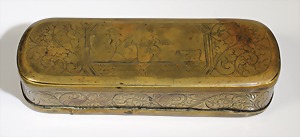 "ISERLOHNER TABAKDOSE" (TABATIERTE), 2.Hälfte 18.Jhd., Messing, abgerundeten Ecken und Scharnierdeckel. Gravierter Text: wer freyen will muß höflich seyn sonst fällt er in den Korb hinein ! Der Spruch wird mit entsprechender Szene dargestellt, weiche anschmiegsame Form, ca. 13,5 x 32,0 x 47,5 mm, auf der rückseitigen Abbildung werden die Damen entführt !