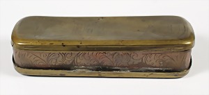 "ISERLOHNER TABAKDOSE" (TABATIERTE), 2.Hälfte 18.Jhd., Messing/Kupfer, abgerundeten Ecken und Scharnierdeckel.Gravierter Text: Sich an Gold und Schätzen Täglich zu ergötzen und zufrieden seyn ist so Thörigt seht ihr Thoren ich ergreife Darum meine Pfeiffe! Der Spruch wird mit entsprechendem Bild dargestellt, weiche anschmiegsame Form, ca. 124 x 26,5 x 46 mm, altersbedingte Fehl-u. Reperaturstelle !