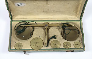Münzwaage um 1800, Hand-Balkenwaage für Dukaten u. Louisdor, 5 Gewichte, orig. Holzschatulle innen mit Ziegenleder ausgeschlagen außen mit geprägtem Papier bespannt, ca. 15,0 x 6,7 x 2,3 cm, schöner Zustand !