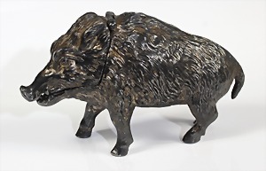 "SPARDOSE" in Form eines Ebers, um 1900, läßt sich im Maul verschließen, zum Öffnen den Kopf heben, L = 115,5 mm, H = 72,0 mm, schöne Pattina !