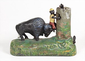 "SPARDOSE" Amerika 1920er Jahre, "BISON", nach dem Einwerfen der Münze läßt sich das Männchen mit dem Kopf des Bisons hochheben, Eisen farbig bemalt, L = ca. 18,7 cm, H = 14,5 cm