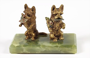 "WIENER BRONZE" um 1900/10, Briefbeschwerer, 2 Terrier, mit Briefen im Maul und Blumen im "Arm", farbig bemalt, grüner Alabastersockel, L = 88,5 mm, H = 61,5 mm