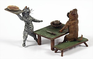 "WIENER BRONZE" 1950/60er Jahre, "HUND" und "KATZE" am Tisch und speisen, farbig bemalt, L = 88,5 mm, H = 61,5 mm, es ist angerichtet !