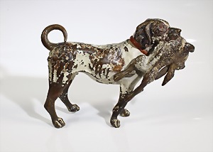 "WIENER BRONZE" um 1900, "JAGDHUND" mit Fedhase im Maul, signiert: M.S, farbig bemalt, L = 13,4 cm, H = 9,7 cm, berieben, schöne Ausstrahlung !