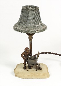 Tischlampe "WIENER BRONZE" um 1900/10, "MARONENRÖSTER", der Maronenröster steht frierend am Ofen u. wartet auf Kundschaft ! Schirm mit Glasperlen besetzt, weißer Marmorsockel, H = 22,5 cm, Lampe brennt !