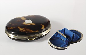 Geldbörse um 1890/1900, schön geflammtes Schildpatt, sig.: BREVEIL ? blauer Stoff mit separatem Fach in der Mitte, ca. 59,2 x 52,8 x 20,8 mm, 1 Seite mit Wappeneinlage Für diesen Artikel ist ein Versand in nicht EU-Länder leider nicht möglich !