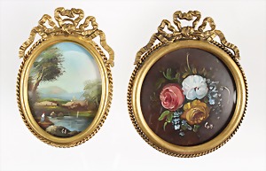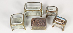 Lot: 4 kleine Glasvitrinen um 1900, Messingeinfassung u. eingeschliffenem Glas. Kleinste Vitrine: ca. B = 73,5 mm, größte Vitrine: B = ca. 113,0 mm; 1 kl. Schatulle mit relieffierte bäuerliche Szene, Kugelfüße, ca. 84,3 x 57,2 x 48,5 mm, alle innen mit kleinen Stoff-Kissen !