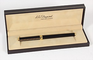 Füller von "S.T. DUPONT" ORFÈVRES A PARIS, Goldfeder 750/000, LAQUE DE CHINE, L = 13,8 cm, mit Ersatzpatronen, Original-Schatulle