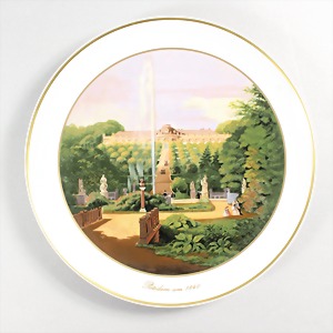 Teller, KPM, Potsdam um 1840, "Königliches Schloß Sanssouci 1843", Goldrand, D = ca. 25 cm