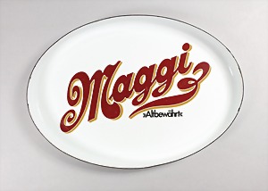 Ovales Tablett Mitte 20.Jhd., "MAGGI" Altbewährt, mehrfarbig emailliert, ca. 37 x 26,3 cm, gut erhalten