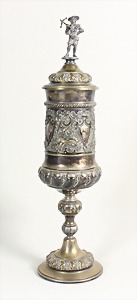 Schützenpokal 1896 (1. Preis Preisschießen1896 Bondorf), Deckelpokal, mit relieffierten Akanthusblättern, florale Elemente, abnehmbarer Deckel mit Armbrust-Schützen, H = ca. 48 cm