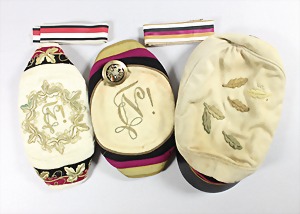 Lot "STUDENTIKA": 1 Schildkappe; 2 Mützen (1 Mütze "Couleur Wittmann" Heidelberg; 2 Bänder u. 1 Knopf
