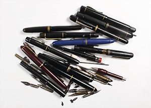 Lot Schreibgeräte: 9 Kolben-Füllfederhalter, davon 1 Geha u. 1 Pelikan; 2 Kugelschreiber u. 1 Stck. mit Glasfeder,….und ein paar Federn !