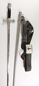 "FREIMAURER" Schwert mit Koppel, Riehmen und Koppelschloss, das Schwert mit den typischen Freimaurersymbolen: Maurer-Zirkel u.-Winkel, Schwert (monogramiert: "G"), L = 89 cm, Klinge ca. 71,5 cm, das Knaufende ziert ein Ritterhelm, rostfreier Stahl, Scheide mit den gleichen Symbolen verziert, guter Zustand !
