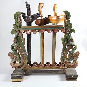 Drei antike "DOLCHE" Asien, gewellte Klingen, 1 Klinge mit Drachenmotiven, Klinge in Damastzener-Technik; 1 weitere Klinge in Damastzer-Technik; Ständer beschnitzt u. farbig bemalt, Griffe u. Metall-Scheiden neuzeitlich ! Ständer ca. 54 x 48 cm