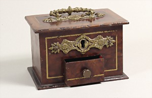 Geldkassette aus Eisen, unten kl. Schublade, Deckel abschließbar, verzierte Messingbeschläge, ca. 14 x 10 x 10 cm, schwer gearbeitet, mit Schlüssel