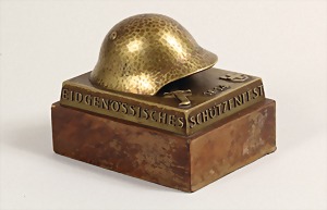 "EIDGENOSSISCHES SCHÜTZENFEST IN LUZERN WEHRMANNSTICH" Stokmann Luzern F ER, Helm mit Schwert 1914, Schweizer Wappen, Bronce auf Holzsockel