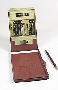 Rechenschieber, Metall, 1 Seite "ADDIATOR Negativ" ADDITION, andere Seite "SUBTRACTION", die Lochreihen sind über einen Stift zu Schieben, gut erhalten !