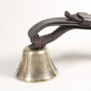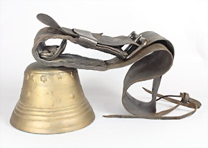 20er "KUHGLOCKE", alpenländisch, diverse Heiligenfiguren: u.a. Maria mit Kind, kräftiger Ledergurt, B = 11 cm, Original-Zustand !