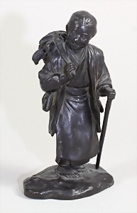 Broncefigur, Japan (Meiji) um 1900, signiert, Bäuerin mit Stock und Feldfrüchten auf dem Rücken, H = ca. 19,0 cm, teilweise nachziseliert (Teil vom Stock fehlt)