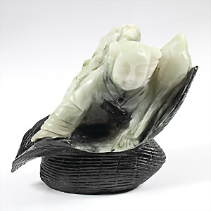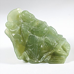 Sitzender "BUDDHA" angelehnt an ein großes Blatt, transparenter lindgrüner Stein (Nephrit ?), H = 10,5 cm, total 1,15 kg