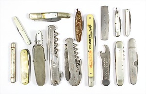 Lot: Messer/Sommelierkorkenzieher, 1 Teil:"afri cola"; 1 Teil "KARL WOLF HEIDELBERG ZIGARRENFABRIK"; 1 Teil "WEINGUT JAKOB GERHARD NIERSTEIN/RHEIN"; 1 feines Taschenmesser mit Perlmutter u. Lederetui L = 76,7 mm sowie andere