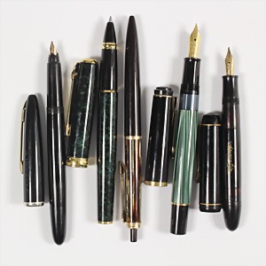 Lot: 1 Kugelschreiber "PELIKAN" 455- GERMANY, L = 13,2 cm; 1 Kolben-Füllfederhalter "DIPLOMAT" mit 14 K Goldfeder L = 13,3 cm; 1 "HAWEKO DIA" 803 07, mit 14 K Goldfeder L = 11,5 cm, 1 "PELIKAN" GERMANY Kolben-Füllfederhalter, Edelharz mit grün abgesetzten Streifen; 1 Kugelschreiber "DIPLOMAT" Classik Collection, Edelharz grün marmoriert L = 13,7 cm