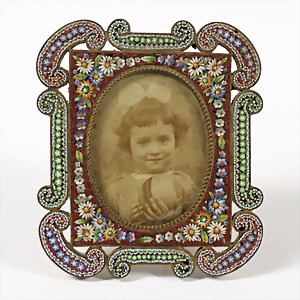 Kleiner Bilderrahmen, Italien um 1900, sehr feines "MIKROMOSAIK" mit verschiedenen Blüten und Ornamenten, mit Aufsteller, ca. 47,7 x 56,0 mm, über 1000 kleine Glassteinchen !