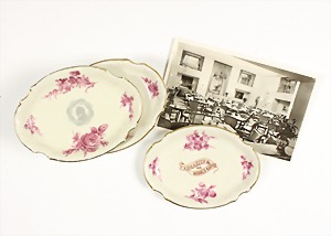 6 Gebäcktellerchen 1950er Jahre aus dem Kaffé "KRANZLER in BERLIN", Postkarte mit Innenansicht aus dem Jahre 1954 (U.S.Zone)