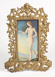 Bilderrahmen "JUGENDSTIL" um 1900, seilich von 4 Puttis umspielt, schöne Broncierung, mit Aufsteller, Rahmen: ca. 22 x 31 cm, Maße: Bild ca. 9,5 x 18,5 cm