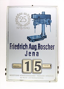 Kalender 1940er Jahre, 25 Jahre Friedrich Aug. Roscher Jena, bedruckter Glasdeckel mit Holzgehäuse, ca. 36,2 x 34,2 cm, seitlich 4 Stellschrauben